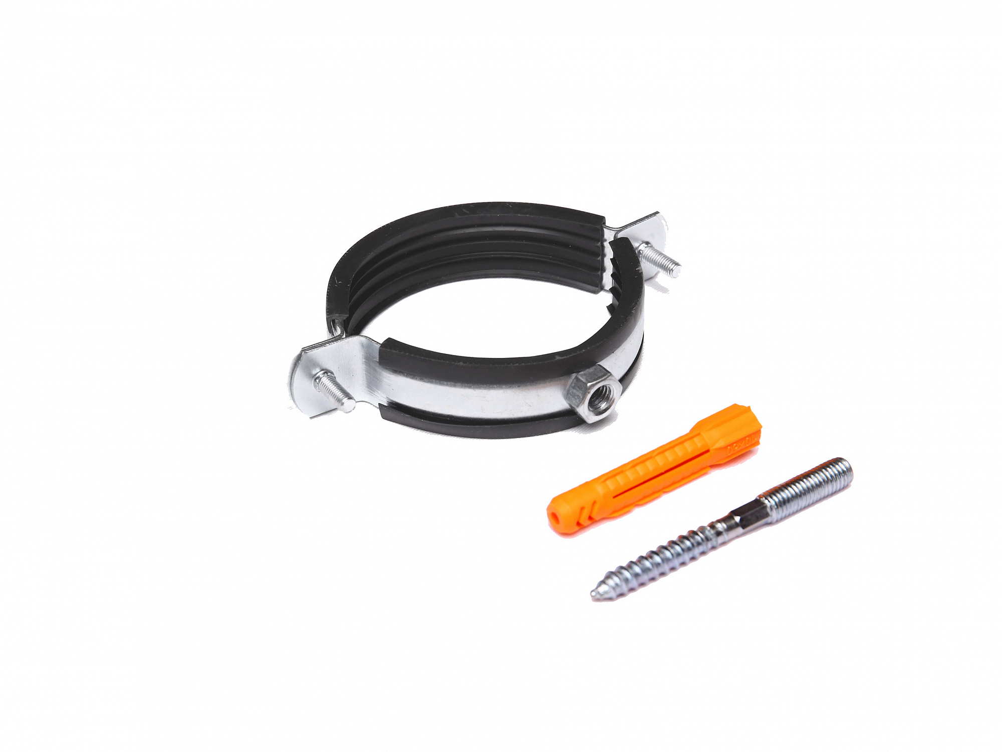 Хомут металлический 2 1/2" (74-80) со шпилькой и дюбелем изготовлен из оцинкованной стали с резиновым уплотнителем из EPDM