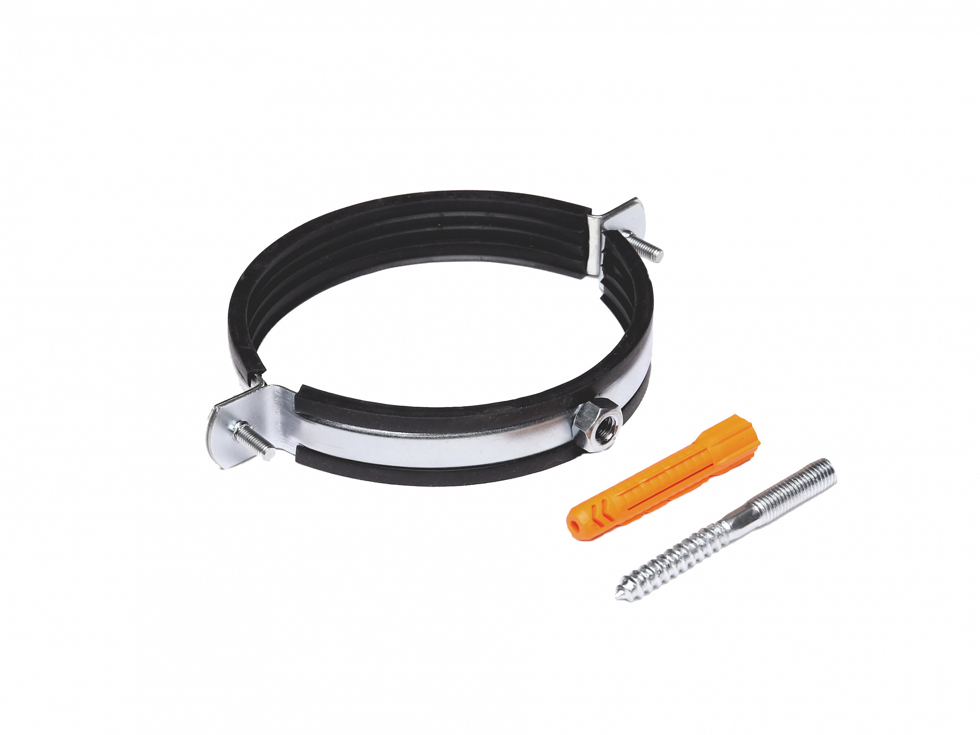 Хомут металлический 4" (110-111) со шпилькой и дюбелем изготовлен из оцинкованной стали с резиновым уплотнителем из EPDM