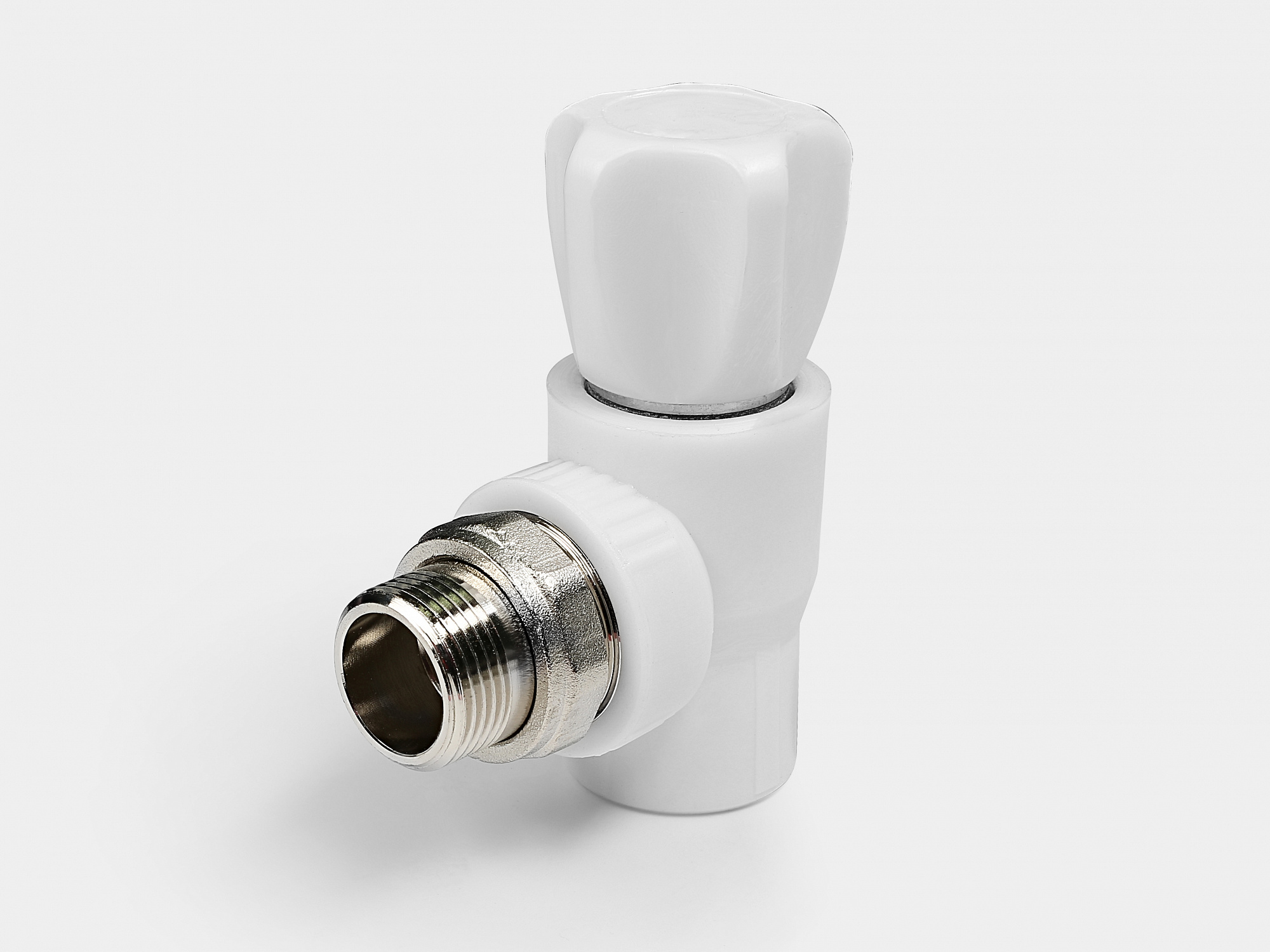 Вентиль полипропиленовый радиаторный НР D25-3/4" угловой КОНТУР изготовлен из полипропилена рандомсополимера (PP-R) с механизмом регулирования и закладным элементом из латуни CW617N
